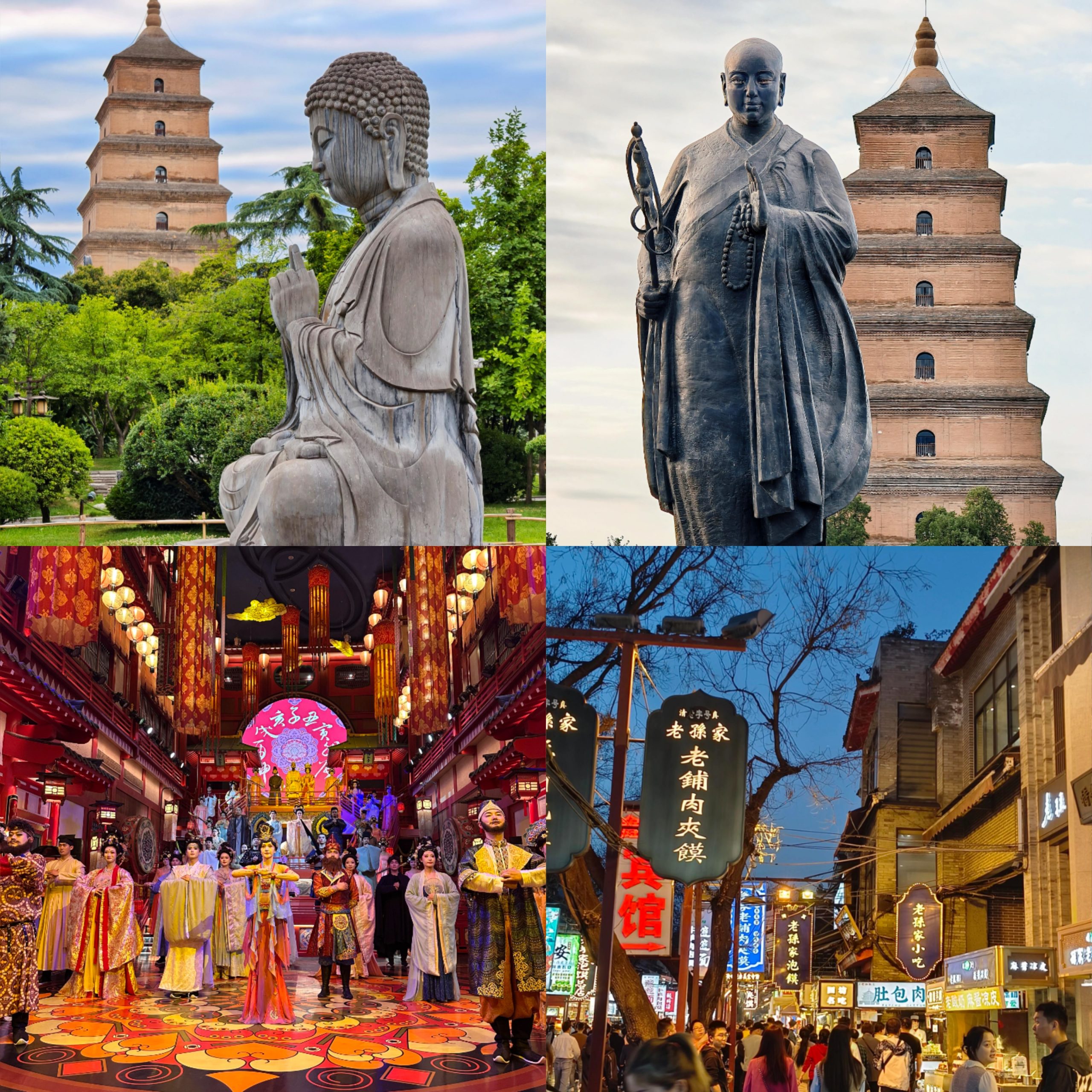 西安三环内专车上门接送,开启最后一天行程。 前往大慈恩寺:乘车前往大慈恩寺(车程约 30 分钟,根据酒店位置调整)。 游览大慈恩寺:进入唐代皇家寺院 —— 参观玄奘法师雕像,了解玄奘西行取经的历史;登大雁塔(可选,登塔费用自理),俯瞰西安市区风貌,感受 “雁塔晨钟” 的意境;参观大雁塔地宫、佛舍利展厅,导游讲解佛教文化与唐代寺院建筑特色,解读大慈恩寺与玄奘的深厚渊源。前往附近餐馆,品尝西安特色美食(如葫芦鸡、锅盔夹辣子、烩菜),满足味蕾体验。乘车前往西安明城墙(车程约 20 分钟)。登上中国现存规模最大、保存最完整的古代城垣 —— 可选择步行(推荐从永宁门登城,步行至文昌门,沿途欣赏城墙内外风光)或骑行(自行车租赁费用自理,单人车 45 元 / 100 分钟,双人车 90 元 / 100 分钟);导游讲解明城墙的建造工艺、历史作用,介绍永宁门、安定门等城门的文化内涵,感受古都西安的 “城郭记忆”。 前往回民街:乘车前往回民街(车程约 15 分钟)。逛吃回民街在导游推荐下打卡地道美食 —— 老孙家羊肉泡馍(百年老字号)、贾三灌汤包(牛肉馅必点)、甑糕(软糯香甜)、黄桂柿子饼(甜而不腻),避开 “网红陷阱店”,边吃边听导游讲解回民街的历史与民俗文化。返回酒店稍作休息,整理行李,为夜游大唐不夜城储备精力。前往大唐不夜城乘车或乘坐地铁前往大唐不夜城(车程约 30 分钟)。夜游大唐不夜城,漫步南北走向的文化步行街,看唐代风格建筑、灯光秀,偶遇 “不倒翁小姐姐”“画中人” 等沉浸式演出(免费);参观贞观之治、开元盛世等主题雕塑,感受盛唐气象;可自行购买文创产品(如唐装玩偶、书法作品),体验大唐文化魅力。乘车返回酒店休息,结束当天行程。